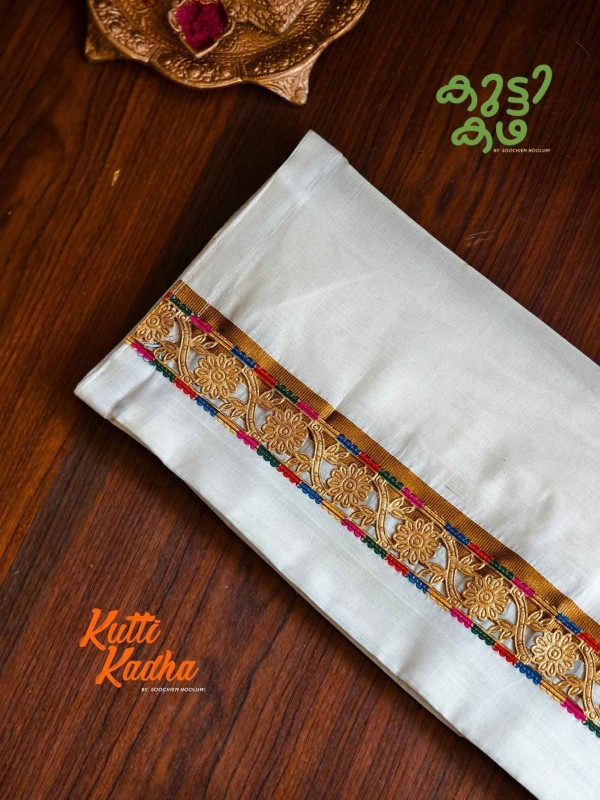 A refined take on tradition, this elegant white Kasavu mundu is elevated with a striking handcrafted central border. The pristine off-white fabric is complemented by a rich golden kasavu edge, while the highlight lies in the vibrant multicolour woven detailing running down the center—an artistic blend of heritage craftsmanship and contemporary charm.