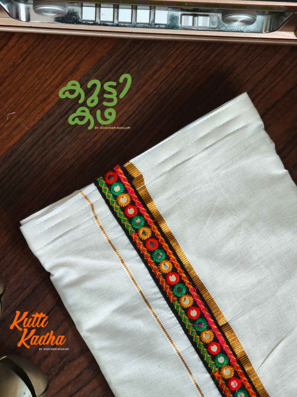 A refined take on tradition, this elegant white Kasavu mundu is elevated with a striking handcrafted central border. The pristine off-white fabric is complemented by a rich golden kasavu edge, while the highlight lies in the vibrant multicolour woven detailing running down the center—an artistic blend of heritage craftsmanship and contemporary charm.
