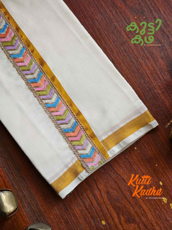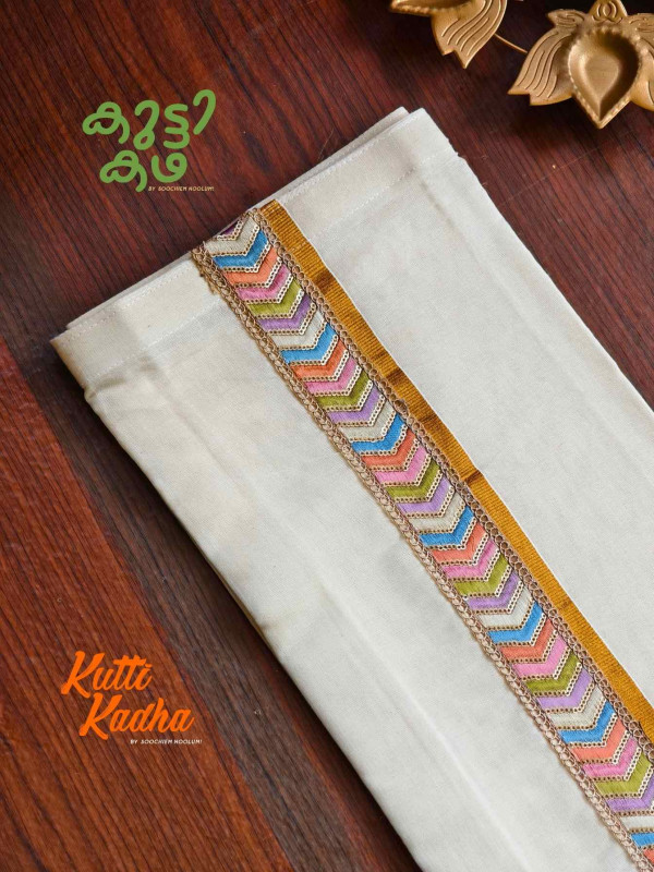 A refined take on tradition, this elegant white Kasavu mundu is elevated with a striking handcrafted central border. The pristine off-white fabric is complemented by a rich golden kasavu edge, while the highlight lies in the vibrant multicolour woven detailing running down the center—an artistic blend of heritage craftsmanship and contemporary charm.