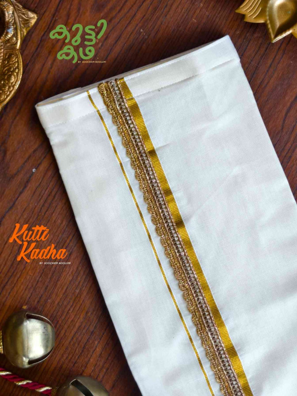 A refined take on tradition, this elegant white Kasavu mundu is elevated with a striking handcrafted central border. The pristine off-white fabric is complemented by a rich golden kasavu edge, while the highlight lies in the vibrant multicolour woven detailing running down the center—an artistic blend of heritage craftsmanship and contemporary charm.