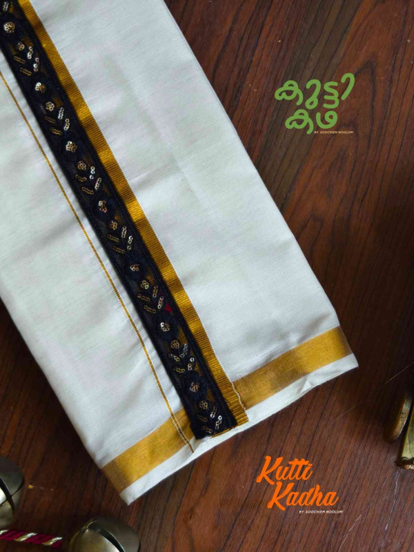 A refined take on tradition, this elegant white Kasavu mundu is elevated with a striking handcrafted central border. The pristine off-white fabric is complemented by a rich golden kasavu edge, while the highlight lies in the vibrant multicolour woven detailing running down the center—an artistic blend of heritage craftsmanship and contemporary charm.