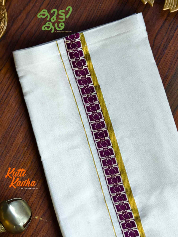 A refined take on tradition, this elegant white Kasavu mundu is elevated with a striking handcrafted central border. The pristine off-white fabric is complemented by a rich golden kasavu edge, while the highlight lies in the vibrant multicolour woven detailing running down the center—an artistic blend of heritage craftsmanship and contemporary charm.