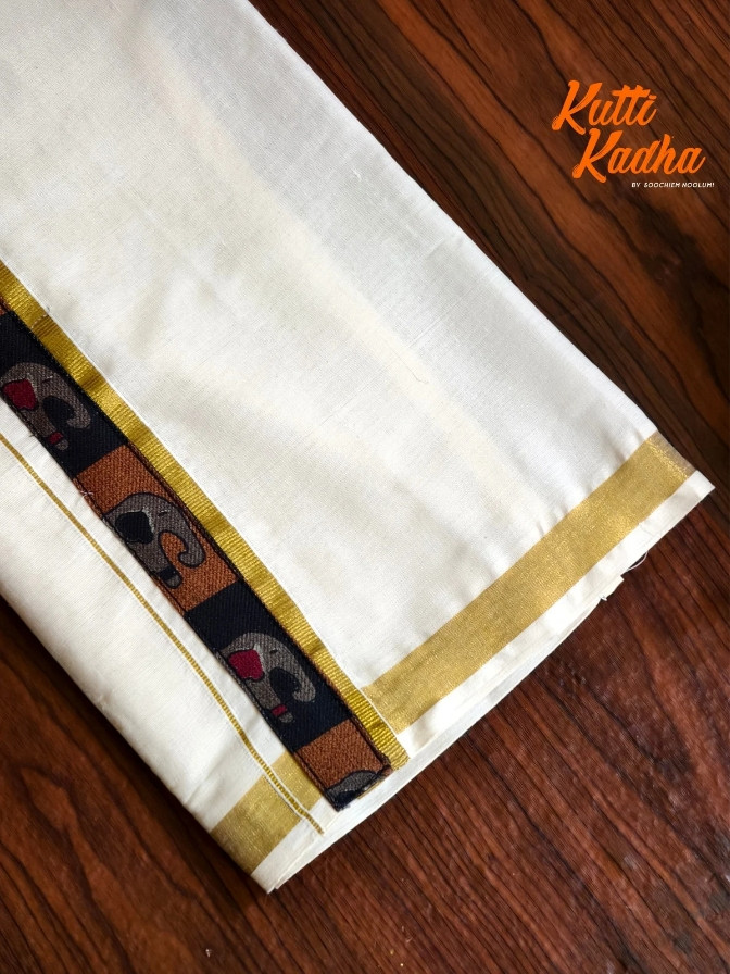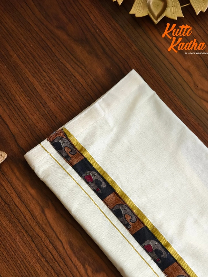Celebrate tradition with a touch of charm in this Kutty Kaadha Kasavu Mundu designed specially for kids. Made from soft, breathable cotton, this elegant white dhoti features a rich golden border complemented by a vibrant peacock feather motif embroidery along the side. Symbolizing grace and divinity, the peacock pattern adds a colorful festive appeal, perfect for occasions like Onam, Janmashtami, or temple ceremonies. A perfect blend of comfort, culture, and style for your little one.