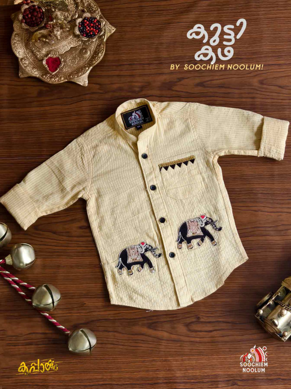 Introducing AANA KUTTI, a playful and stylish Chiku/cream color Embroidery Patch Shirt for kids from Kutti Kadha by Soochiem Noolum. Crafted from soft Chiku color cotton, this charming shirt features exquisite Kantha embroidery, highlighted by delightful black embroidered elephant patches that showcase a mischievous charm.