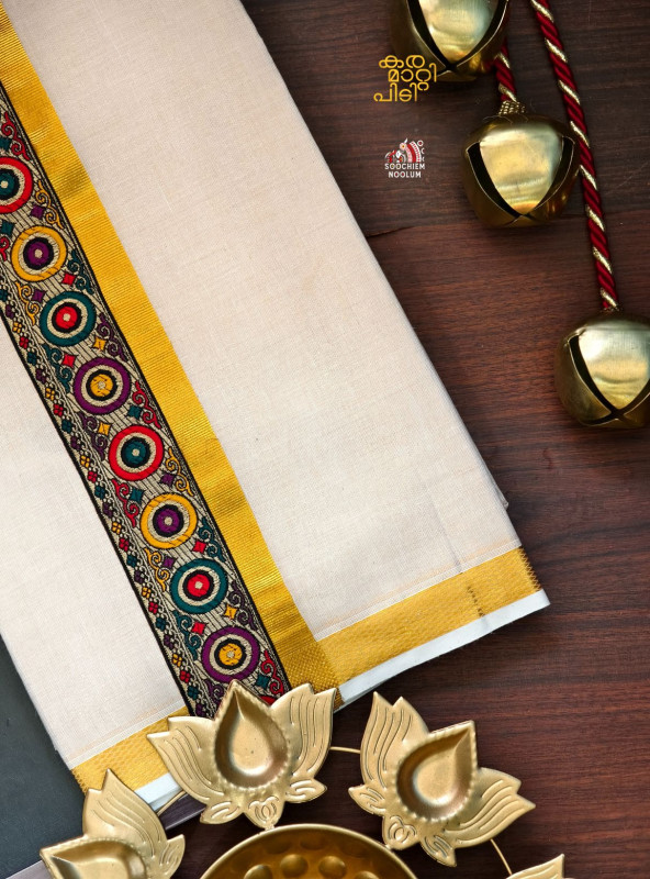 Product Specifications: Multi Colour Embroidery Golden Kasavu Single Dhoti