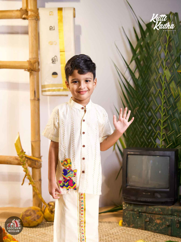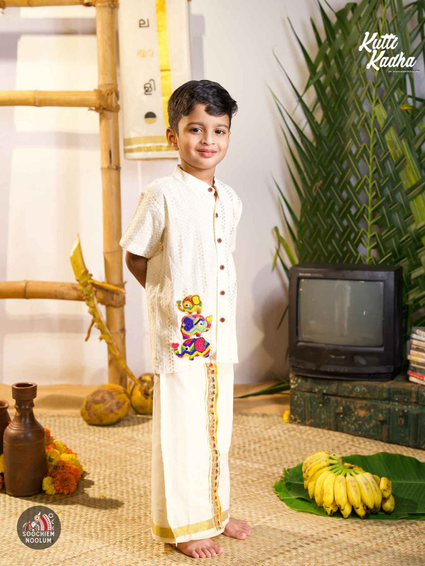 Dress your child in playful sophistication with the delightful MOONNU AANA shirt by Kutti Kadha!