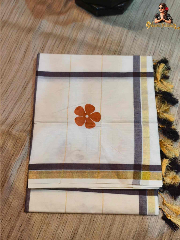 Big Checked Cotton Kasavu Saree With Shalabham Thumbi and Flower and Hand Blocks