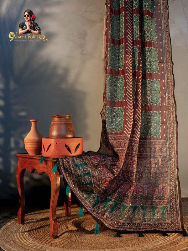 The saree features a rich deep teal green base adorned with intricate geometric and traditional motifs, perfectly contrasted by a warm maroon and earthy brown border and pallu. The detailed patterns along the border enhance its regal appeal, while delicate thread tassels on the pallu bring a playful yet graceful finish.