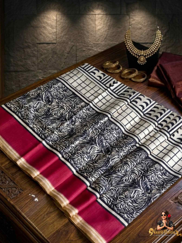Elevate your ethnic wardrobe with this elegant Tusser silk saree that beautifully blends tradition with contemporary aesthetics. Crafted from rich, textured Tusser silk, this saree features a striking combination of black and ivory patterns highlighted with a deep magenta pallu and border, finished with subtle golden zari detailing for a refined touch.