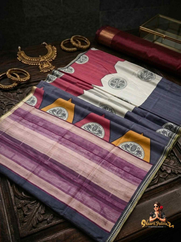 Elevate your ethnic wardrobe with this exquisite Tusser Silk Saree, a perfect blend of subtle elegance and artistic detailing. The saree features a graceful interplay of muted mauve, deep charcoal grey, soft beige, and rich maroon tones, beautifully layered in a striped pattern across the body. The highlight lies in its contemporary pallu design, adorned with bold geometric blocks in mustard, ivory, and rose hues, accentuated by intricate traditional circular motifs that add a touch of heritage charm.