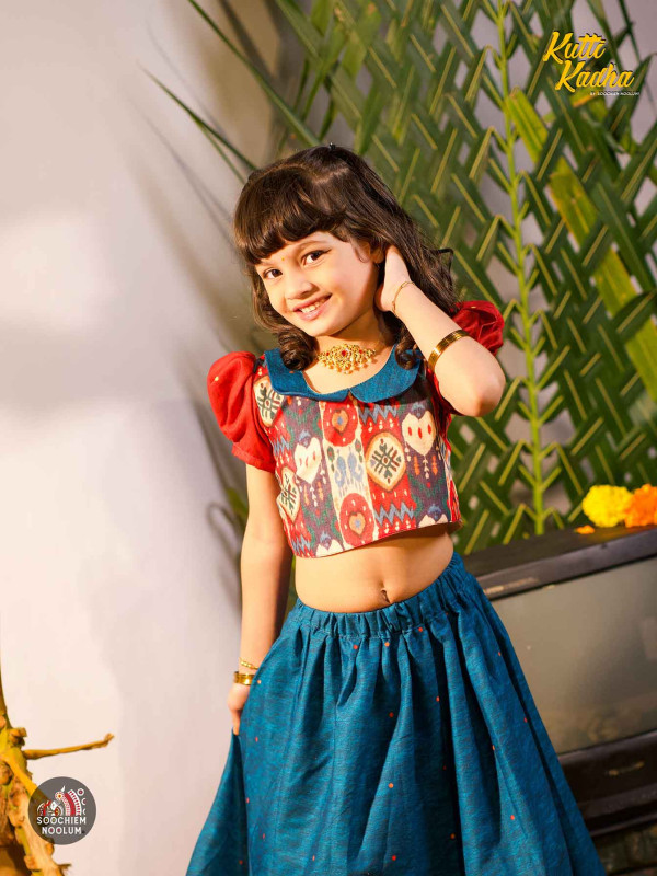Introducing Nirakkoott, a delightful Gathered Skirt and Top collection from Kutti Kadha by Soochiem Noolum. Crafted from soft cotton fabric, this charming ensemble features intricate contemporary ikat patterns, enhancing its elegance and texture.