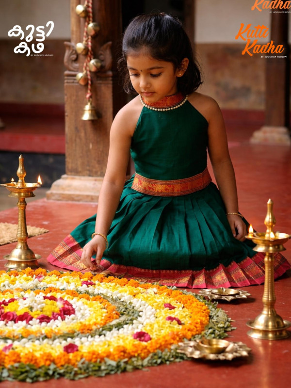 The rich emerald green Narayanpet weave, highlighted with intricate zari borders in warm tones, gives this set a regal and heritage-inspired appeal. The halter-style top features a finely detailed neckline and is paired with a gracefully flared skirt that moves effortlessly with every step. A beautiful bow detail at the back adds a delightful touch of sophistication and playfulness.