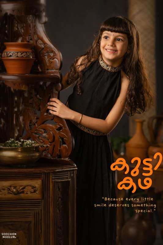 The rich black silhouette is accentuated with classic Narayanpet-inspired borders, adding a touch of heritage charm. The sleeveless top features a refined neckline and is paired with a gracefully flared skirt that allows ease of movement. A delicate bow detail enhances the overall look, giving it a playful yet sophisticated finish your child will love.
