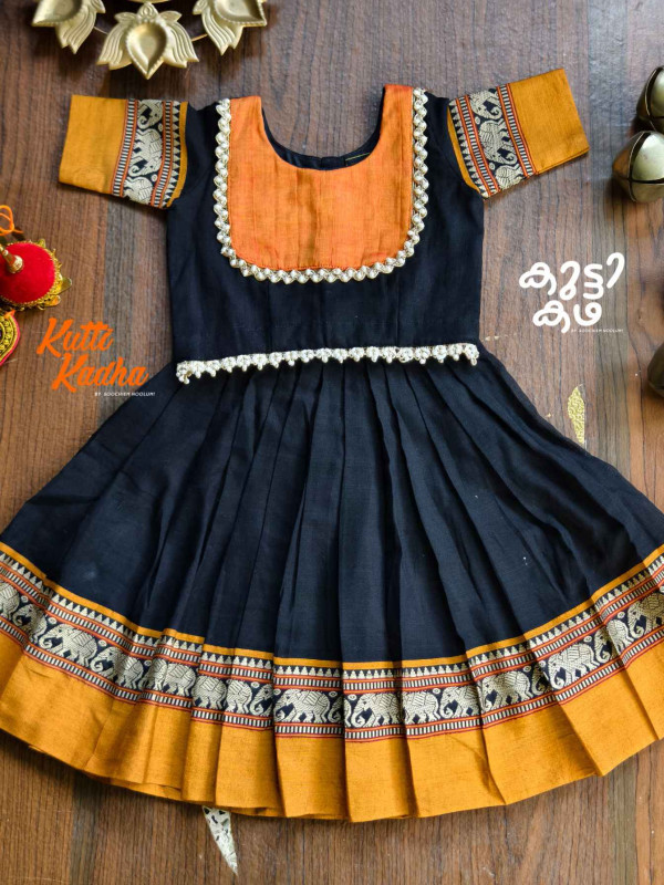 The outfit features a stunning combination of deep tones accented with traditional zari borders, showcasing intricate motifs that reflect classic South Indian artistry. The structured top is enhanced with delicate detailing, while the flared skirt adds a graceful, twirl-worthy silhouette. A charming bow at the back completes the look with a touch of playful elegance.