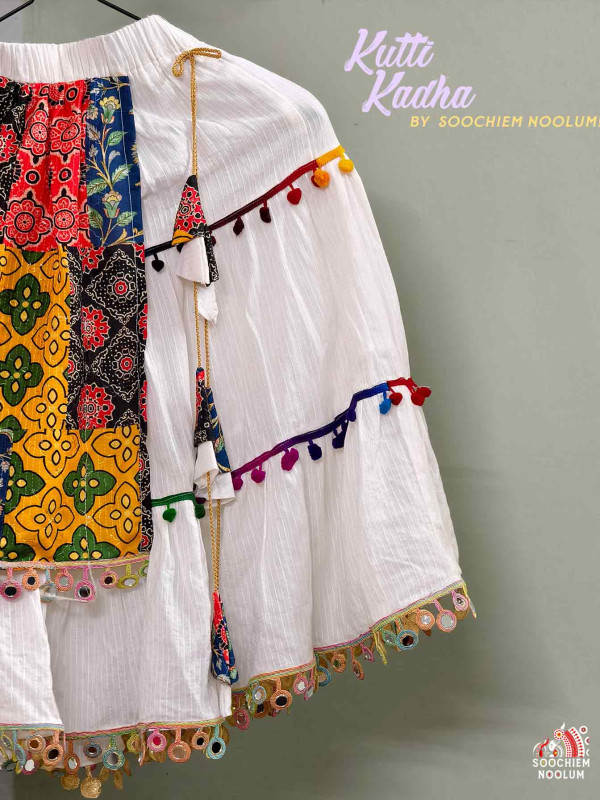 The set features an elegant white cotton blouse adorned with a striking center designer patch, intricately embellished with vibrant Ajrakh Kalamkari prints on a luxurious rayon crochet fabric. The blouse is tastefully accented with mirror lace detailing and playful pom-pom embellishments, adding sparkle and fun to any occasion.