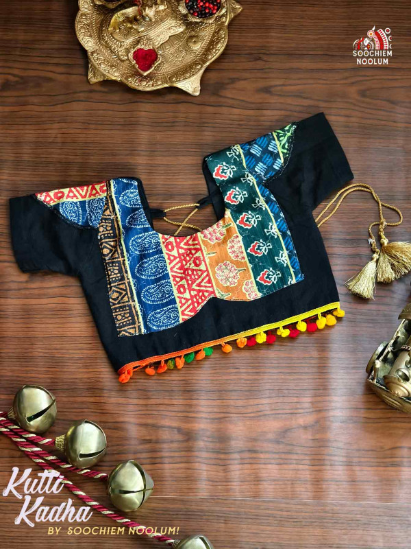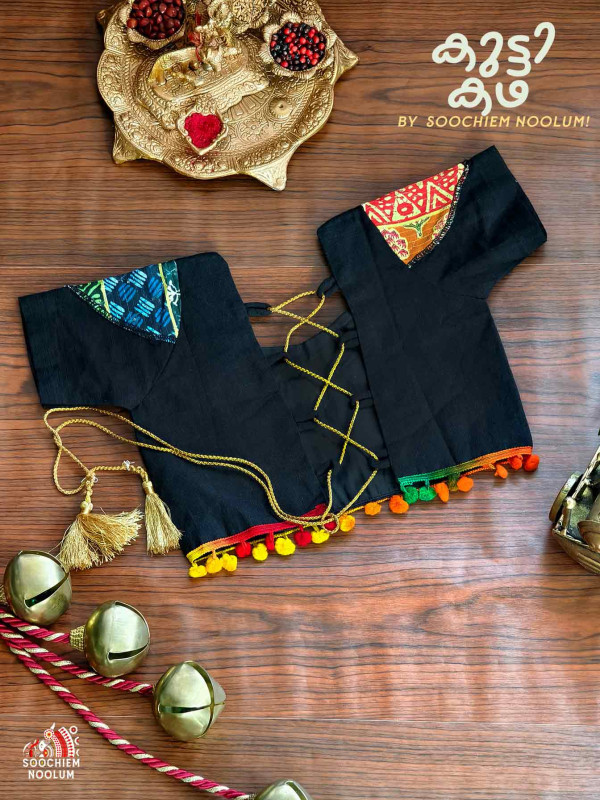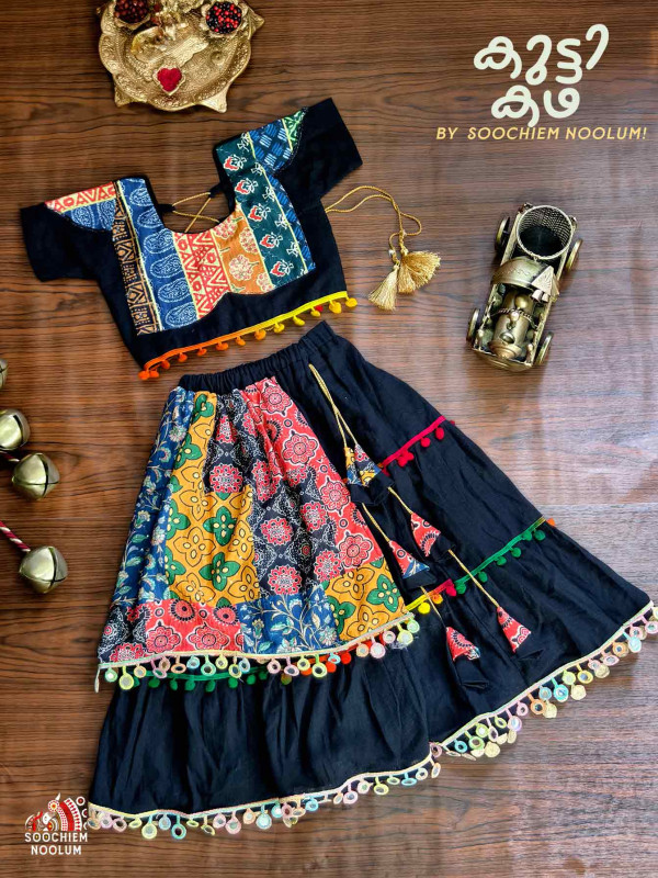 The set features an elegant black cotton blouse adorned with a striking center designer patch, intricately embellished with vibrant Ajrakh Kalamkari prints on a luxurious rayon crochet fabric. The blouse is tastefully accented with mirror lace detailing and playful pom-pom embellishments, adding sparkle and fun to any occasion.