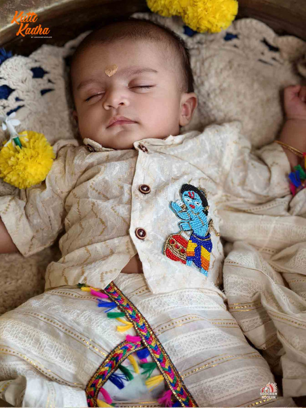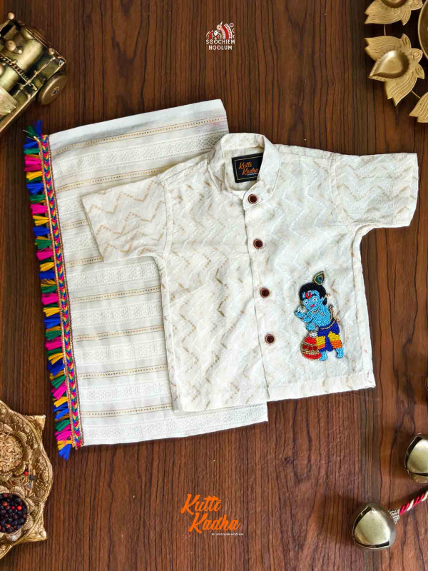 Celebrate tradition with a touch of divine charm! This elegant ivory white shirt is crafted from a rich jacquard fabric featuring intricate zig-zag patterns and wooden buttons that add a classic finish. The highlight is the adorable hand-embroidered Baby Krishna motif on the chest — perfect for festive occasions like Krishna Janmashtami or temple visits.